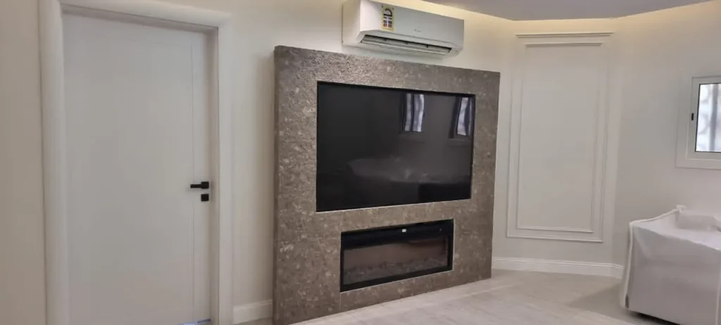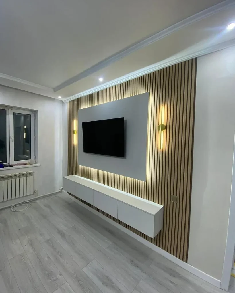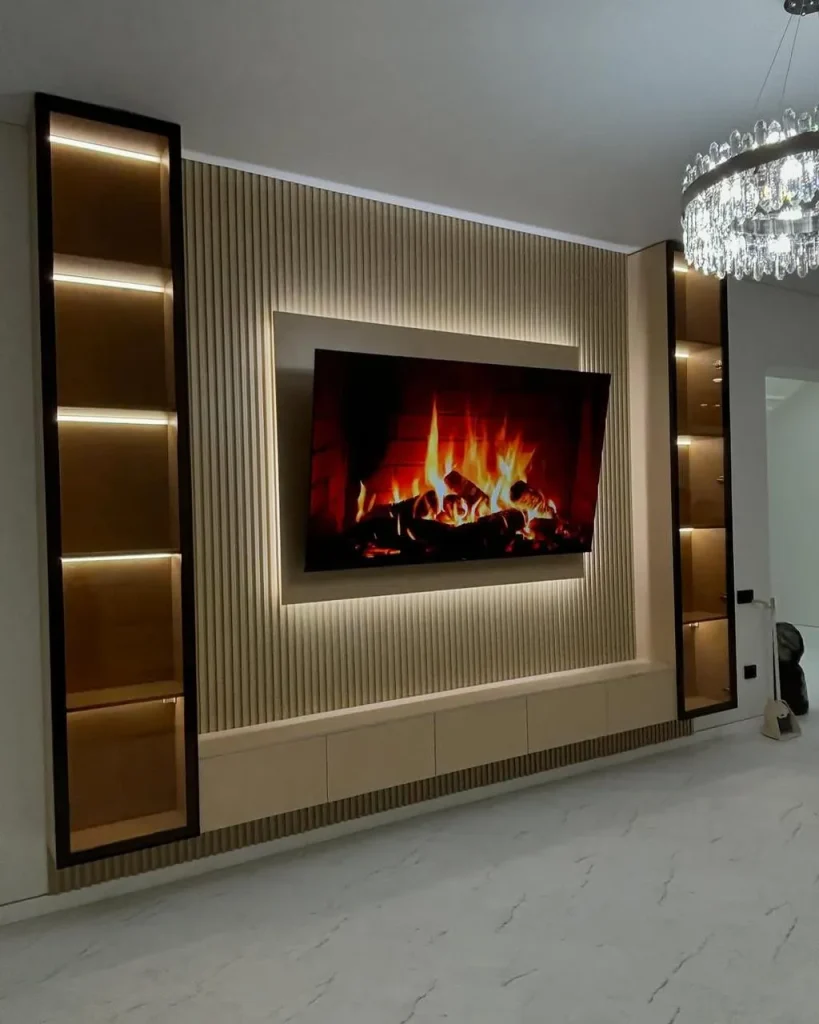 - إضافة لمسات خشبية دافئة في الديكور تعطي شعورًا بالدفء، ويمكن استخدام الخشب في الوحدات التحكم أو الرفوف المحيطة بالتلفزيون.